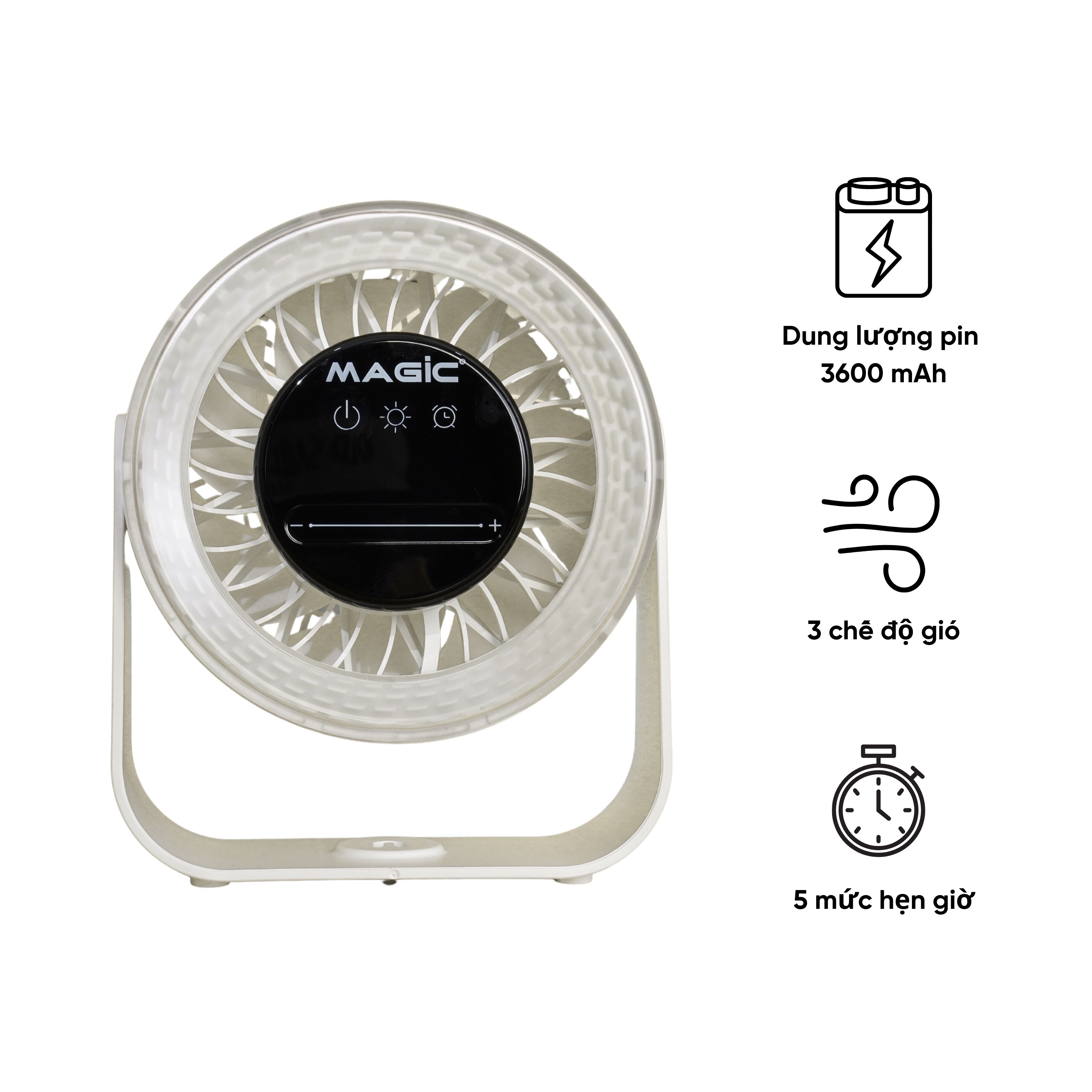 Quạt Sạc MAGIC A-010 sở hữu Thiết kế Thông minh mang lại gấp 3 lần tiện ích so với quạt thường. Khác biệt hoàn toàn với các dòng quạt kém tiện ích (không có hẹn giờ, pin yếu), A-010 tích hợp: 3 Chế độ gió thông minh, 5 mức hẹn giờ linh hoạt, và Pin 3600 mAh cho thời gian sử dụng lên đến 8 giờ. Sự kết hợp này mang đến trải nghiệm làm mát toàn diện, thông minh và bền bỉ, vượt xa mọi dòng quạt sạc thông thường.